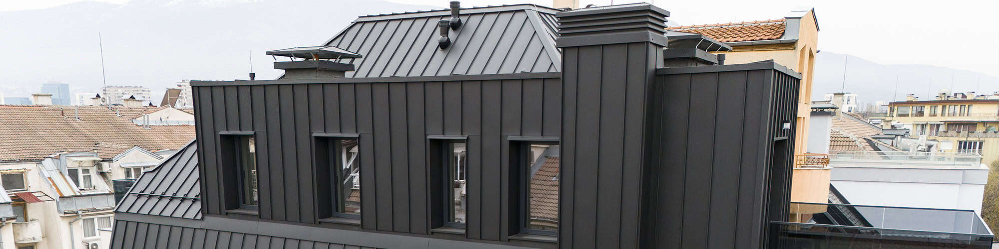 ВАС ПРО реализира цялостен покривен проект на еднофамилна жилищна сграда в София, използвайки системата FALZON® - едно от най-атрактивните решения за покрив и фасада при съвременното строителство. Проектът демонстрира комплексния подход на ВАС ПРО към покривните системи - от конструктивния слой до финалното водоотвеждане и естетическото завършване. Цялата обвивка е изпълнена от стоманена ламарина с полиестерно покритие в специалния цвят RR33, с дебелина 0,6 мм - наситен, дълбок нюанс, осигуряващ едновременно висока атмосферна устойчивост и изразителна визия. Полиестерното покритие гарантира дълготрайна защита срещу UV лъчение, корозия и механични въздействия. Покривът е изграден върху дървена конструкция. Системата е проектирана като вентилиран покрив, осигуряващ непрекъснато въздушно движение под покривната обшивка - ключова мярка за предотвратяване на кондензация и удължаване живота на конструкцията. Вентилацията е допълнена с прецизно разпределени вентилационни отдушници за покрив, интегрирани в общата архитектура. Проектът включва пълен набор от ламаринени детайли, изработени по мярка. Покривното било е прецизно оформено за максимална водонепроницаемост в най-уязвимата зона на покрива - горния хоризонтален ръб, където се срещат двата ската. Изпълнени са също коминни шапки за защита от атмосферни влияния, жалузийна шапка за функционална вентилация с контролиран въздушен поток, шапки или капаци по бордовете като завършващи детайли, и окомплектовки от ламарина около прозорците за плътно и хидроизолирано свързване с покривното покритие. Водоотвеждащата система включва улуци и водосточни тръби, изпълнени в съответствие с цвета и материала на покрива. Комплексното водоотливно решение гарантира ефективно отводняване при интензивни валежи и дълъг експлоатационен живот без поддръжка. За естествено осветление и проветрение са монтирани покривни прозорци VELUX GLL (фиксирани) и VELUX GLU (с горна ос на отваряне и вградена вентилационна система), осигуряващи комфортна жизнена среда без нужда от поддръжка. Монтажът е изпълнен с пълна хидроизолационна окомплектовка, интегрирана в покривната система FALZON®.
